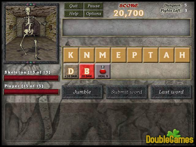 קרב בדרך שלך דרך ממרתפי יצורים באמצעות לחשים מילה כנשק שלך. Dungeon גלול נתיכים האתגר של המשחק מילה מרוב התרגשות של האוצר מחפש במעמקי עכור. חולדות הפיצוץ, שלדים ואפילו דרקון או שניים כפי שאתה עושה את דרכך 25 במרתפי שונים! לאן לא משחק מילה נעלם לפני ... אל השאול!