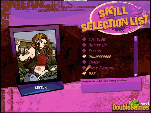 קרב בדרך שלך דרך בתיכון זה משחק 3 התאמה ייחודית, המבוססת על הסרט תכונה, Mean Girls! אויבים סגולה שלך בצד שלך, לגמרי או להשפיל אותם באמצעות הפופולריות שלך ואת המיומנות. התכוונת בנות: תיכון גלוי הקלפים גם מאפשר לך להתאים אישית את הדמות שלך ג `תכונות וכישורים מיוחדים, קבלת עימות זה ייחודי. להביא שלום במסדרונות ידי יצירת אוטופיה בתיכון, או לנצל את הכוח שלך כדי לשים אותך ואת החברים שלך על השולחן הטוב ביותר בקפיטריה!